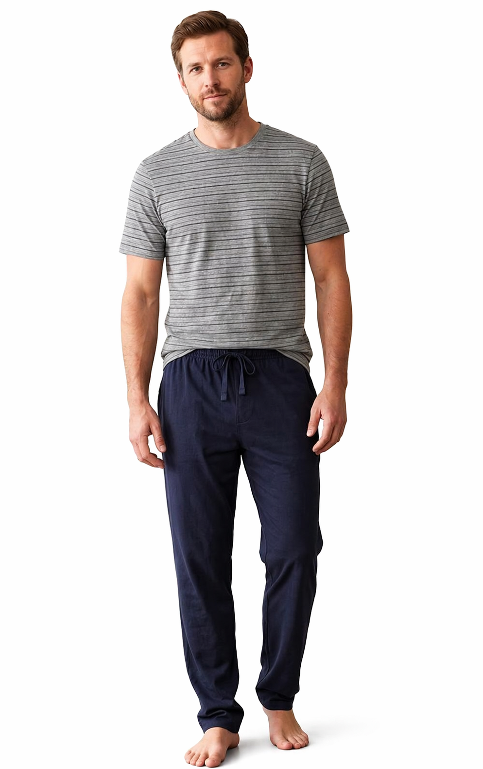 Pohodlné pánské pyžamo nebo domácí oblečení. Černé spodní dlouhé kalhoty a šedočerný jemný proužek na tričku.