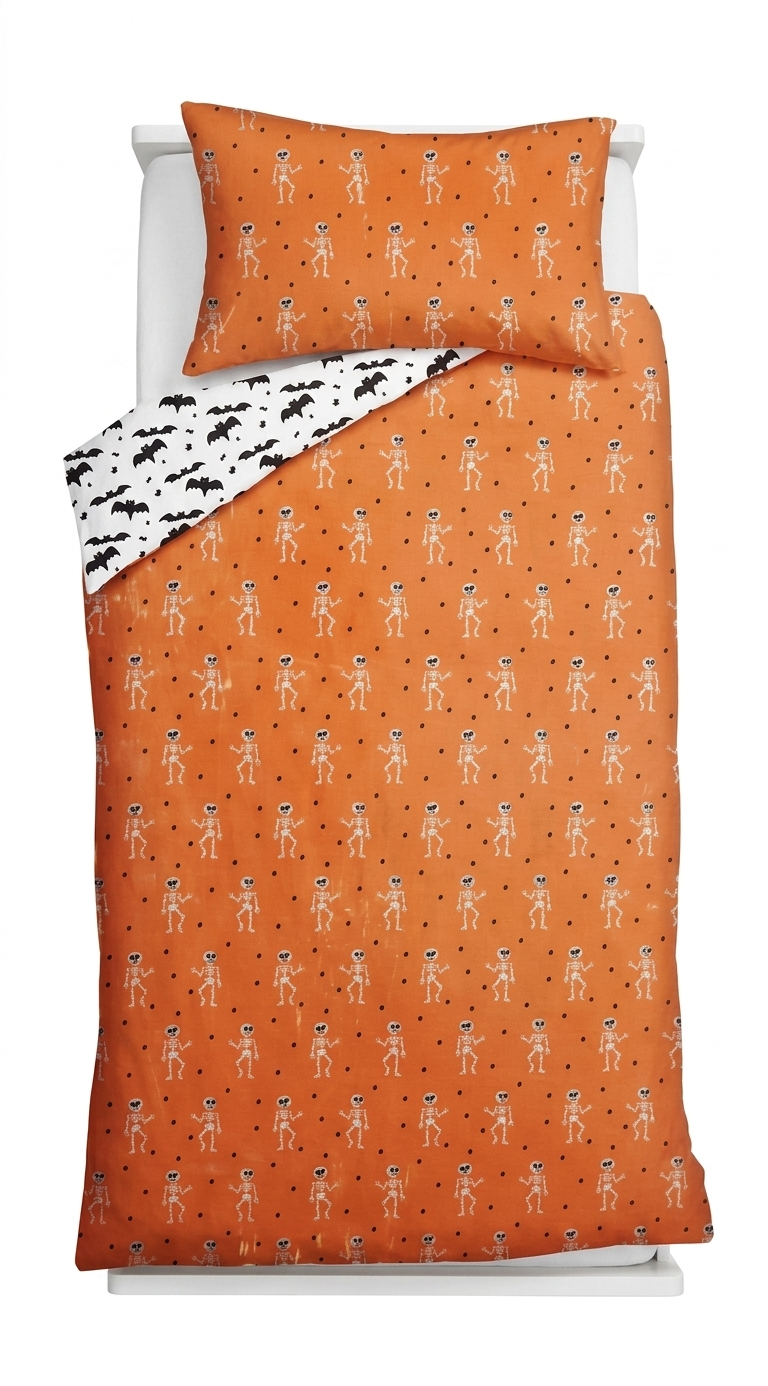 Stylové povlečení na Halloween! Oslavte svátek všech duchů tímto bavlněným povlečení s černými kočkami, dýněmi a létajícími netopýry.